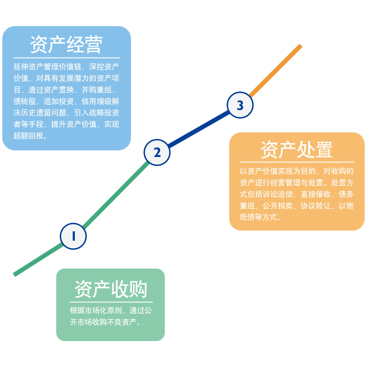 不良资产收购、经营和处置是万博体育3.0客户端下载资管公司所有业务体系的核心。公司通过公开市场收购不良资产,并采取诉讼追偿、重组、转让等方法对资产进行经营管理及处置,实现资产的价值回归或提升。可收购的资产包括债权类资产、股权类资产、实物类资产及其他权益类资产等。